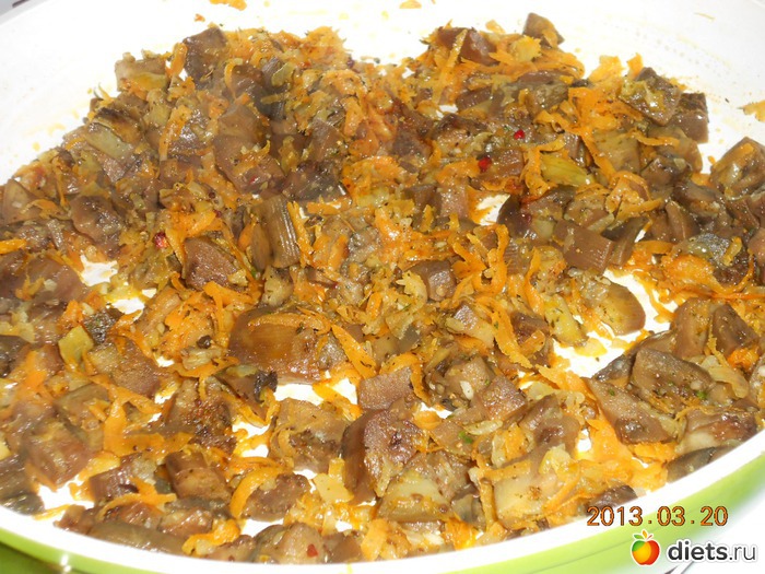 Баклажан чищу и режу на мелкие кубики, посолить дать уйти горечи, отжать и на сковороду к овощам и тушить под крышкой почти до готовности