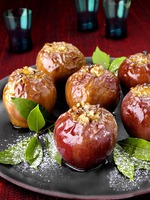 Яблоки вымыть, обсушить, осторожно удалить сердцевину вместе с семенами, не прорезая яблоко насквозь. Начинить творожной массой, поместить в форму, застеленную пергаментом