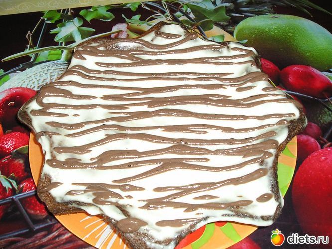 Остывший корж разрезать горизонтально на 2 части, щедро смазать кремом, он больше похож на пудинг, сверху то же смазать кремом. Две столовые ложки крема отложить и смешать с какао и украсить тортик.