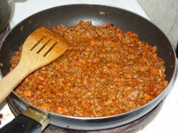 Далее нужно на оливковом масле обжарить фарш вместе с луком. Фарш Вы можете приготовить самостоятельно. Необходимо пропустить мясо через мясорубку.