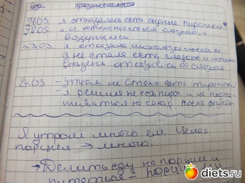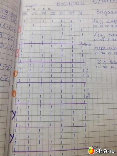 У меня есть правило - без мучного и сладкого. Удачные дни я отмечаю зеленым маркером (длинная вертикальная полоска). Неудачные можно не отмечать, но здесь у меня они отмечены оранжевым маркером.