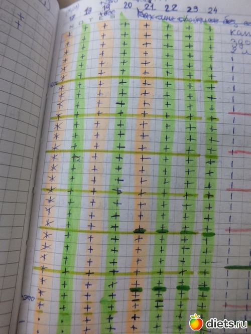 Один плюсик - это 50 Ккалорий. Заранее распределяю горизонтальными цветными линиями, сколько калорий приходится на каждый прием пищи (завтрак самый обильный, питание шестиразовое - для разгона метаболизма) + подписываю дополнительные калории внизу, которые прибавляю к приему пищи после тренировки (чтобы кормить мышцы).