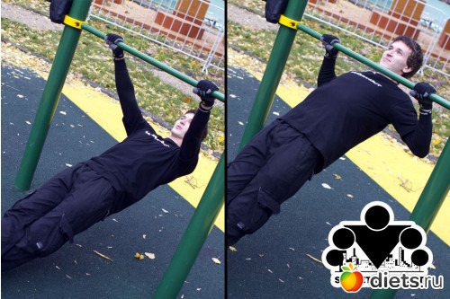 После того как вы хорошо освоите технику, нужно будет научиться выполнять движения вверх и вниз на 5 счетов. Кроме того, по мере прогресса в тренировках можно будет постепенно регулировать высоту перекладины и точки опоры, уменьшая угол между телом и полом до тех пор, пока исходное положение тела не станет горизонтальным, в результате чего вам придется удерживать на руках почти весь его вес. Переходить этот горизонтальный предел я не советую, чтобы не оказаться в очень уязвимом положении, если руки сорвутся с перекладины.