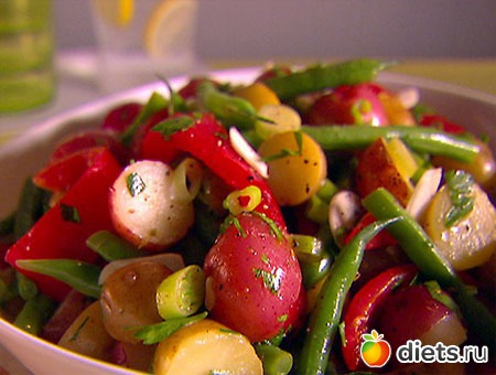 Яблоки очистить, удалить у них семенные коробки и нарезать так же, как овощи. Промытые листья салата разрезать на две-три части, а огурцы нашинковать ломтиками. Нарезанные овощи и плоды смешать, добавить консервированный зеленый горошек, слегка посолить, поперчить и заправить при подаче на стол. В салат можно добавить лимонный сок.