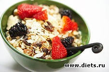 Завтрак: овсяная каша с тертым яблоком, кусочками фруктов и толченых лесных орехов, стакан яблочного сока.