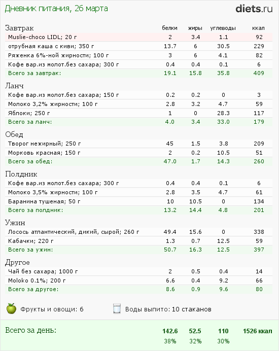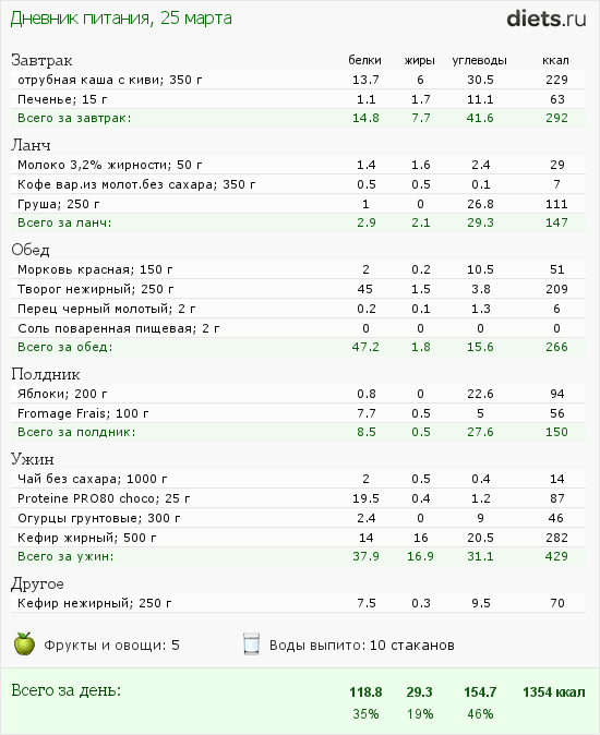 Вот такое меню получилось, не знаю почему здесь у меня по калориям выходит что кефир я пила жирный на ужин, на каробке было написанно 0,1% а тут как то получился жирный