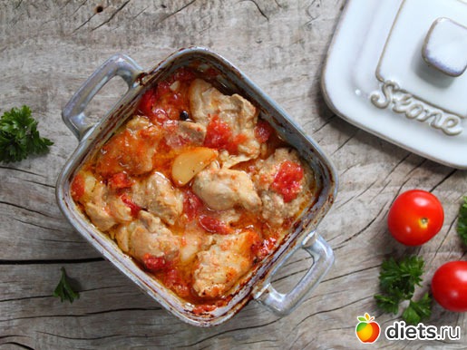 Помидор нарезать мелкими кубиками. Добавить к курице спустя 20 минут от начала приготовления. Убрать форму в духовку и готовить еще 15 минут.