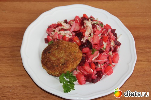 Овощи отваривала в мультиварке, добавила яблоко капусту и лук.заправка лимонный сок и масло.