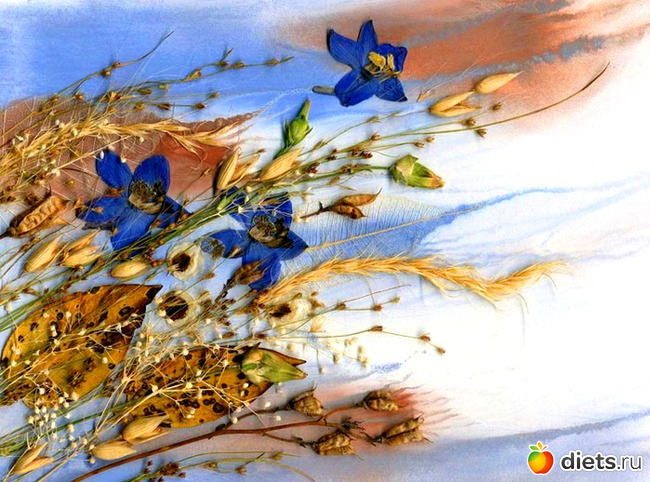 "Улетел..."из цветков дельфиниума, листики и злаки. Фон - монотипия