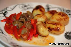Мясо нарезаем небольшими кусочками. Укладываем на дно кастрюли. Следующий слой - лук, порезанный соломкой, потом очищенный от кожицы мелко нарезанный помидор, дальше - наструганный соломкой сладкий перец. Сверху укладываем несколько ломтиков сливочного масла. Накрываем крышкой, ставим на огонек ниже среднего и забываем о кастрюле на час-полтора.