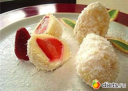 Сфорированные конфеты обвалять в кокосовой стружке и подать на стол.