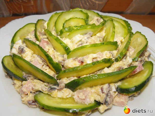 Все ингредиенты смешать (кроме огурцов), посолить, заправить майонезом или сметаной, перемешать. На плоской тарелке сформировать салат горкой. Нарезать тоненькие полоски огурца и, начиная с макушки, по часовой стрелке, наискось, поочередно вдавливаем их в салат и так до самого низа.