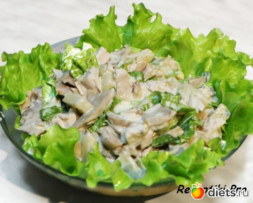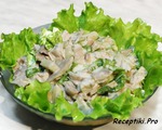 4 Все ингредиенты поместить в одну посуду, полить майонезом и хорошо перемешать. Для эстетики подавать это блюдо можно на тарелке с заранее уложенными листьями салата.
