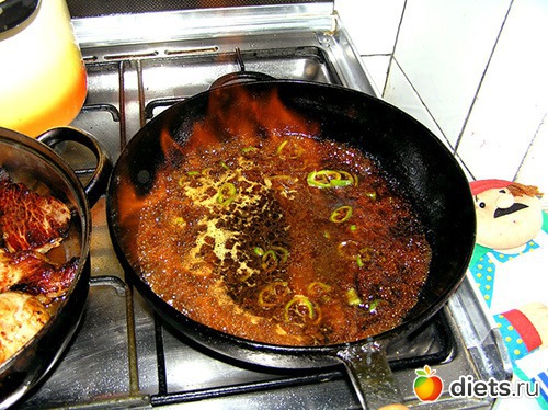 А на раскаленную сковороду, на которой жарилось мясо, выливаем имбирно-медово-коньячный соус. Он может вспыхнуть, но быстро погаснет.