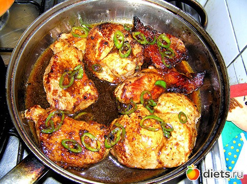 Пока мясо маринуется, готовим соус. На мелкой терке трем имбирь – около 2 столовых ложек, половину перца режем тонкими колечками, добавляем 1 столовую ложку меда и вливаем коньяк. Все перемешиваем и пока отставляем.