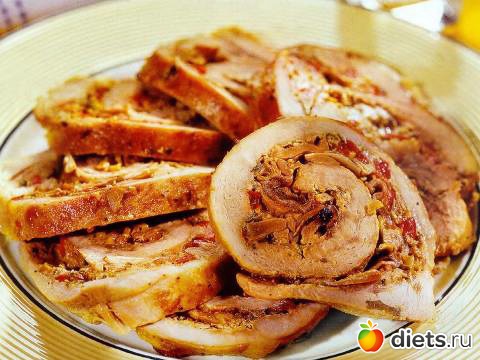 Разогреваем духовку до 200 гр. С. Рулет поливаем соусом и ставим в духовку на 1,5 часа. Периодически поливаем рулет выделяющимся соком.