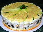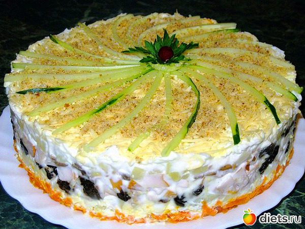 Украсить торт по своему вкусу или как показано на фото: соломкой из огурца, измельчёнными грецкими орехами, листиками петрушки и ягодой клюквы.