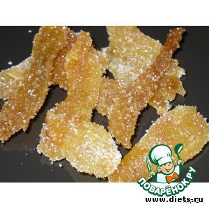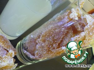 Достаем из сиропа каждую пластину и обмакиваем в сахар (у меня коричневый и обычный белый). Можно в сахар добавить лимонной кислоты на кончике ножа. Оставшийся сироп добавьте в имбирный чай