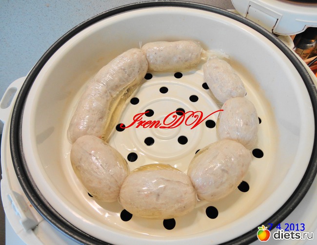Затем кладем наши колбаски в пароварочную вставку и готовим на пару 60 минут.