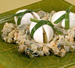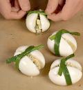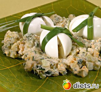 Положить в 4 половинки белков по 1,5 ст. л. салата. Накрыть вторыми половинками. Оставшийся салат разложить по тарелкам. Яйца перевязать перьями зеленого лука и поместить сверху на салат.
