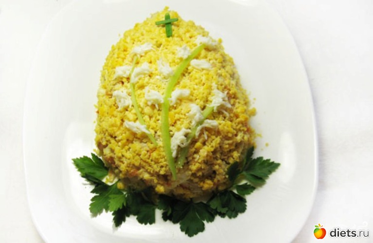 Салат «Пасхальное яйцо» - оригинальный и вкусный салат в форме пасхального яйца, который хорошо смотрится на праздничном столе в Пасху. Сам салат может быть практически любым, главное - оформление.