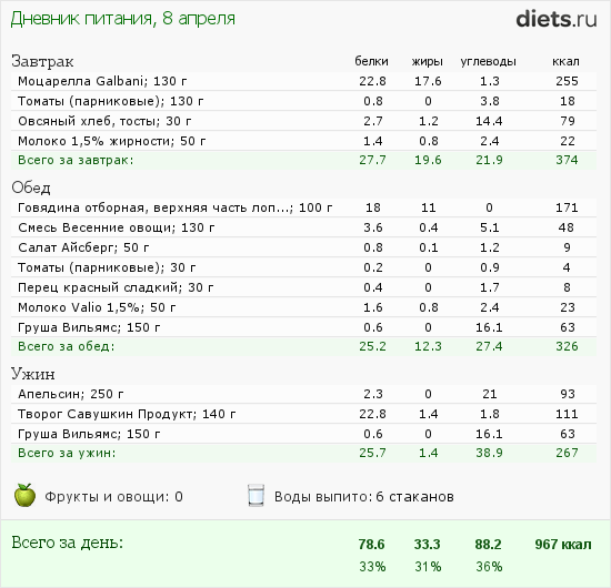 Конечно, сложно высчитывать БЖУ, но благодаря дневнику питания на сайте, стараюсь есть только то, что положено.