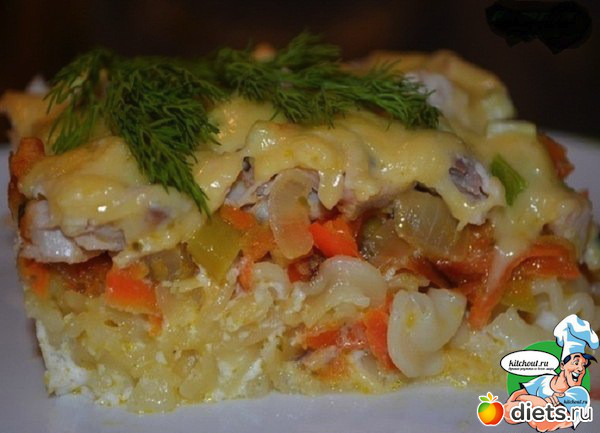В форму выкладываем слоями:макароны, овощи, мясо, залить молочной смесью.