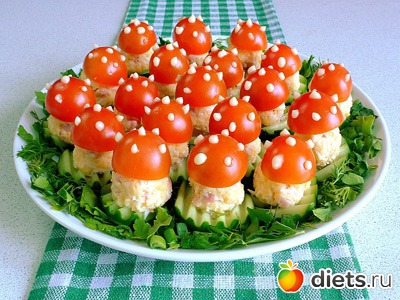 Смешать в миске все порезанные и потертые продукты, посолить и заправить майонезом. Помидоры черри разрезать пополам, а огурец нарезать кружочками толщиной около 0,5 см. - это будут донышки мухоморов. Сервировка - На блюдо выложить зелень, разложить кружки огурца и на каждый кружок положить "шарик" из яично-сырно-ветчинной смеси, чтобы получились ножки, как у грибочков. Накрыть ножки шляпками из половинок помидор черри, украсить шляпку мухомора точечками из майонеза, воспользовавшись зубочисткой. Наша закуска «Мухоморы» к праздничному столу готова!