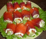Рулетики из форели с огурцами и сливочным сыром Слабосоленая семга или форель — 200 гр., огурец — 2 шт., густая сметана или сливочный сыр.