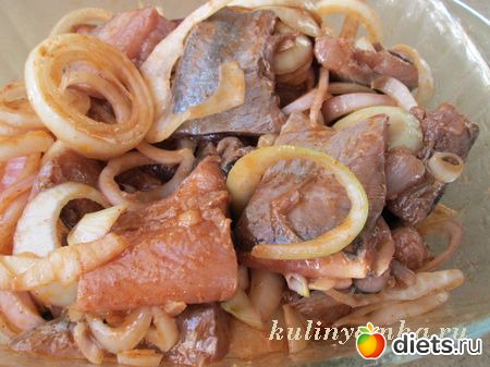 Приготовить маринад. В кастрюле разогреть растительное масло с томатной пастой, перцем и уксусом. Довести до кипения и отставить остывать.
