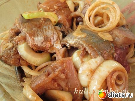 В подготовленную сельдь положить соль, сахар и перемешать. Крупными кольцами нарезать лук. Его можно брать сколько угодно. Он тоже будет очень съедобный.