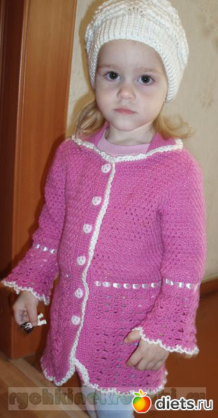 Связан жакетик из хлопковой пряжи «Бамбук». Для работы понадобилось 200г розовой пряжи и немного белой для обвязки, крючок №3, 6 пуговиц, 1м атласной ленточки.