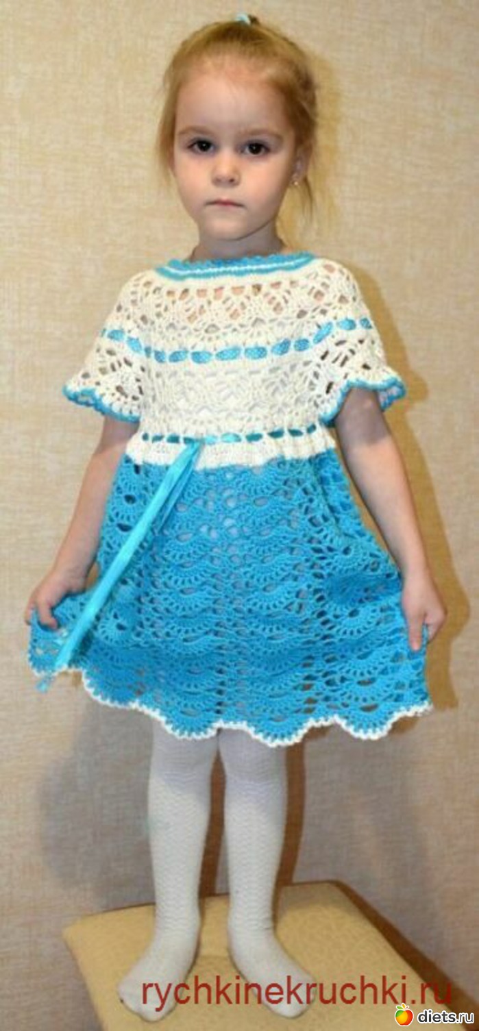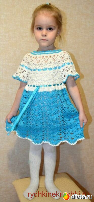 Платье связано на малышку 3-4-х лет из пряжи "Джинс" турецкого происхождения. Пряжа - тонкая, мягкая, слегка бархатистая, очень приятная на ощупь. После стирки изделия из этой пряжи не теряют внешний вид.