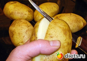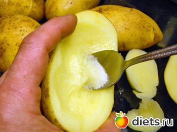 У каждого из хорошо промытых клубней (кожицу, желательно, не очищать, но там, где есть подозрительные места - просто их удалить с помощью ножа) срезаем один бок, меньший половины - приблизительно, в 1/3 толщины (и используем для других блюд).