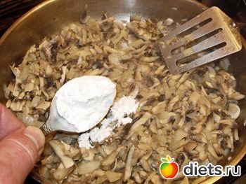 Потушим еще минут пять-семь, помешивая, и добавим половину столовой ложки муки - для загущения жюльена.