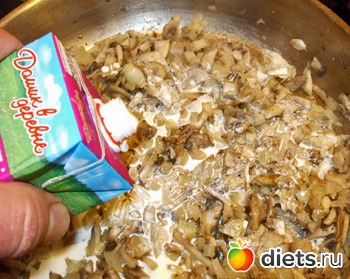 Когда мука немного пожарится (1-2 минуты), вольем 250 мл сливок или столько же сметаны, если по вкусу более приятна пикантная кислинка жюльена.