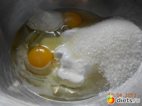 2. Соединяем сметану и яйца. Добавляем сахар, соль, соду, разрыхлитель, растительное масло.