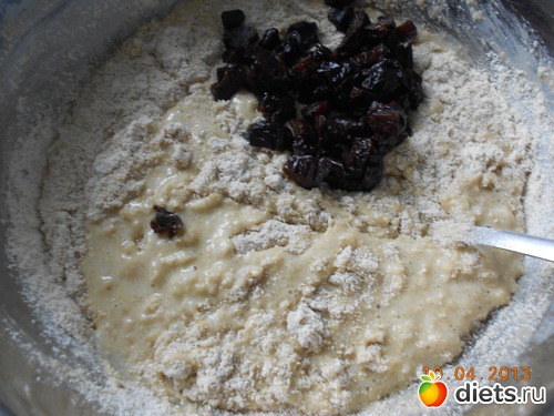 4. Добавляем к смеси остывшую овсянку, чернослив, курагу, клюкву и изюм. Вмешиваем овсяную муку.