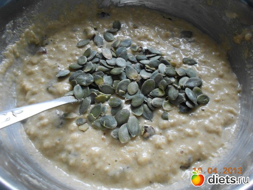 5. В хорошо вымешанное тесто добавляем очищенные сырые тыквенные семечки. Перемешиваем.