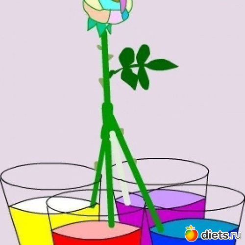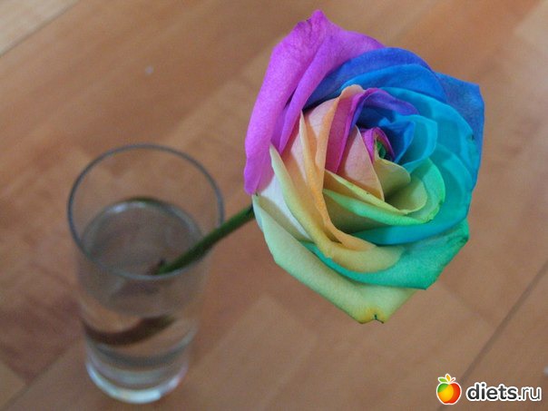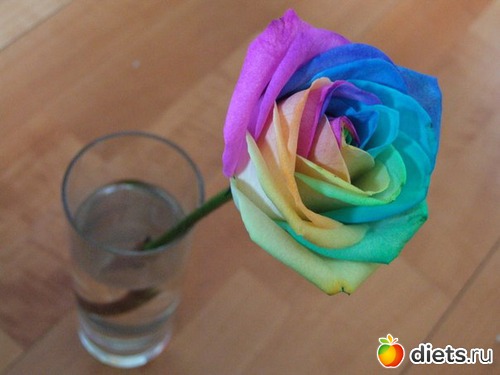 4. Для полного окрашивания розе потребуется 17-20 часов. Если хотите оставить окрашенными только кончики лепестков — 5-8 часов. Можете положить в воду 2 кусочка рафинада, окрашивание пойдет интенсивнее. На белых розах цвет смотрится более ярко, однако можно и поэкспериментировать. Купите желтую розу и поставьте в воду с насыщенно-красным колером. Готово!
