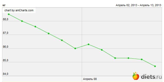 Я со 2-го апреля начала считать калории (коридор от 1000 до 1200). Прошло уже 12 дней и уже видны первые результаты на графике веса (картинку прилагаю). Начальный вес был 88,5кг, а сегодня на весах 84, 7кг.