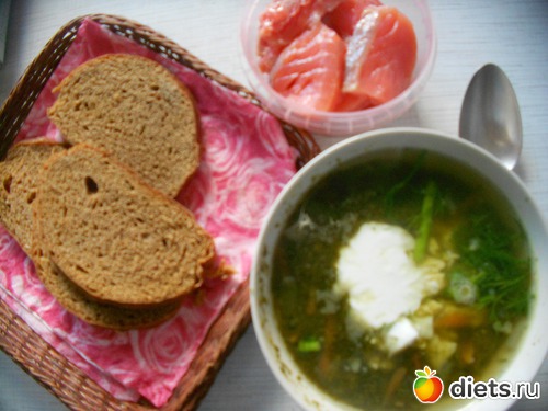 Обед - ели суп из шпината с яичком и сметаной и хлеб с малосольной семгой: