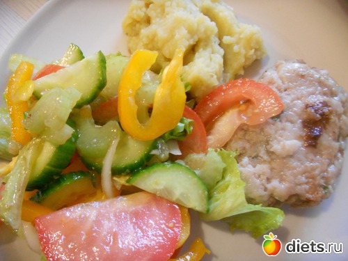 Ужин - куриная котлетка, картофельное пюре (2 ст.л.- если кому-то кажется много), салат: