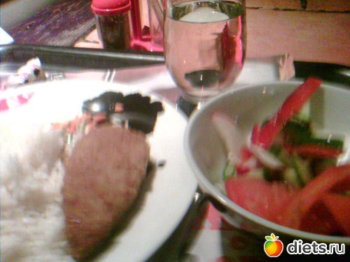 Обед - поскольку с ребенком мы залились на шопинг (мой урожай - 2 упаковки по 5 штук трусиков в Марксе-Спенсере и 2 пакета полезных продуктов), после работы заскочила опять в Му-Му на салатик, котлетку с паровым рисом и березовый сок: