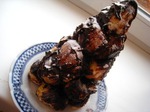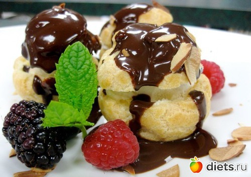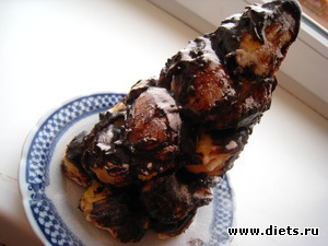 Маргарин смешать с сахаром. Добавить воду. Перемешать. Проварить эту массу на огне в кастрюле. Снять с огня и всыпать пшеничную муку. Снова поставить массу на средний огонь и варить, всё время перемешивая. Тесто будет готово тогда, когда оно перестанет прилипать ко дну. Снять с огня и добавить по одному куриному яйцу, очень хорошо перемешивая. Противень смазать сливочным маслом и выложить профитроли. Размер профитролей должен быть такого же размера, как грецкий орех. Выпекать профитроли при температуре 170 градусов около 25 минут в предварительно разогретой духовке. Готовым шоколадом (я использовала домашний шоколад) полить профитроли и оставить для застывания.
