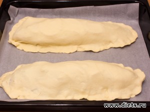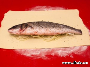 На рыбу выложить лук. Рыбу завернуть в тесто, края защипать. Противень смазать маслом или застелить бумагой для выпечки.