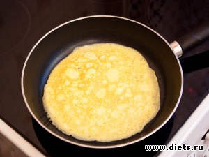 Яйца (каждое отдельно) взбить. Вылить на сковороду, смазанную растительным маслом, пожарить до золотистого цвета. Перевернуть, пожарить с другой стороны. Пожарить, таким образом, 5 блинчиков.