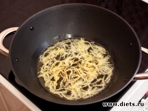 В большом количестве разогретого масла пожарить картофель до золотистого цвета.
