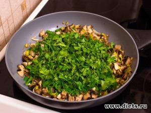 Добавить грибы, посолить, поперчить, жарить 15-20 минут.