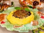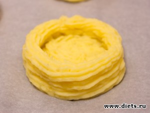 С помощью кулинарного шприца (или просто ложкой) выложить картофельное пюре в виде гнездышек.
